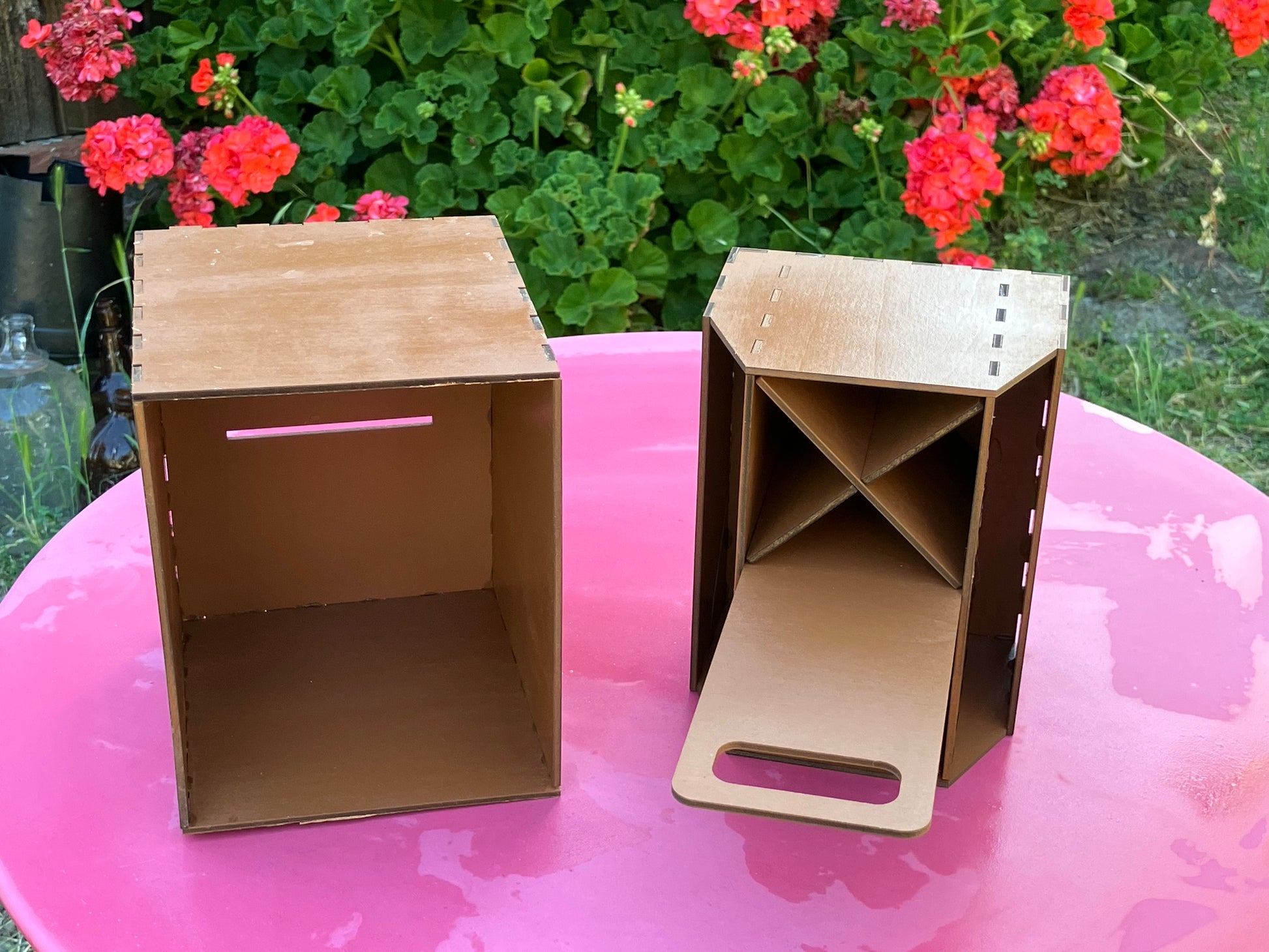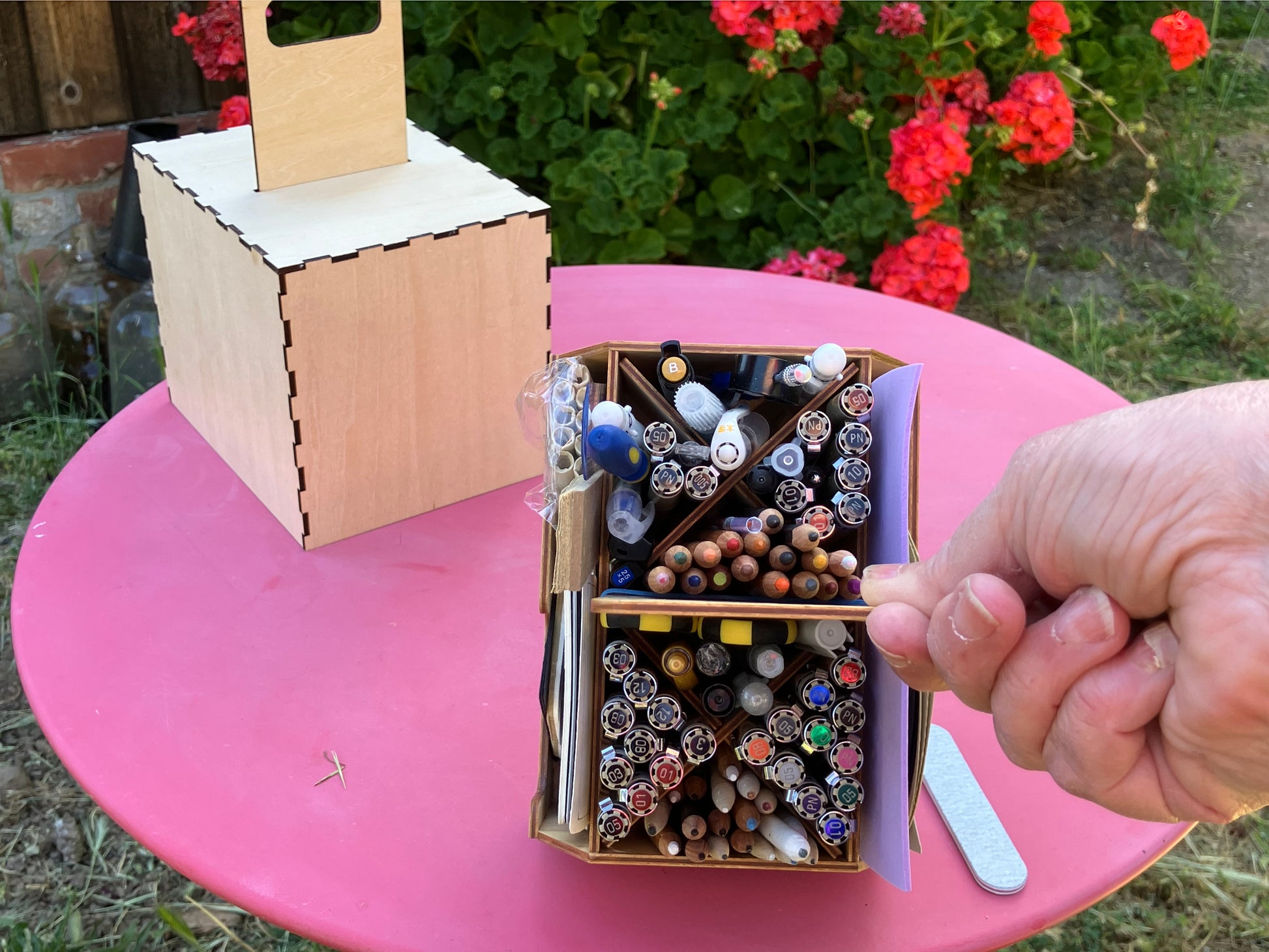 My husband Steve made the first version of this box for me in 2021, and I still use it every day. That original—the one inked, worn, and loved—is the box in the photos. Mine holds watercolor pencils, Microns, Gelly Rolls, chalk pencils, tortillons, tiles, a compass, a brush pen, and more. It keeps everything in one place—so when it’s time to head out and create, I don’t have to gather supplies or wonder what I forgot. I just pick up the box and go.