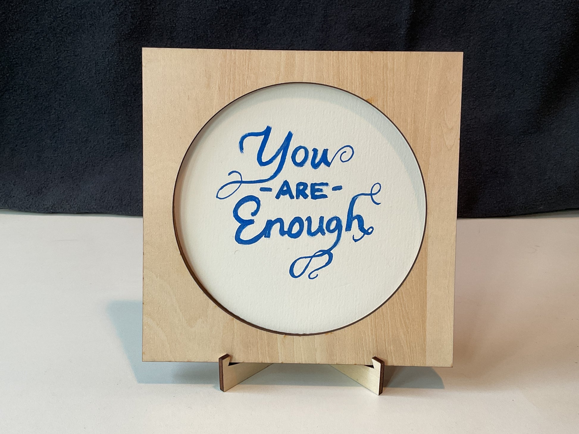 When hung on the wall, the easel legs store neatly in the back holder. When used freestanding, the legs slide into their slots—one engraved “grateful” and the other with a small paw 🐾.
