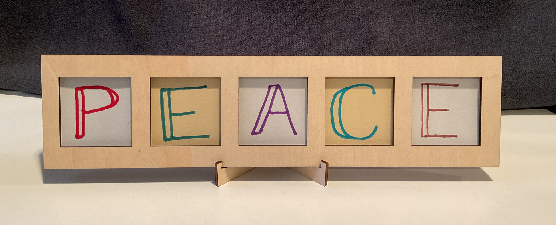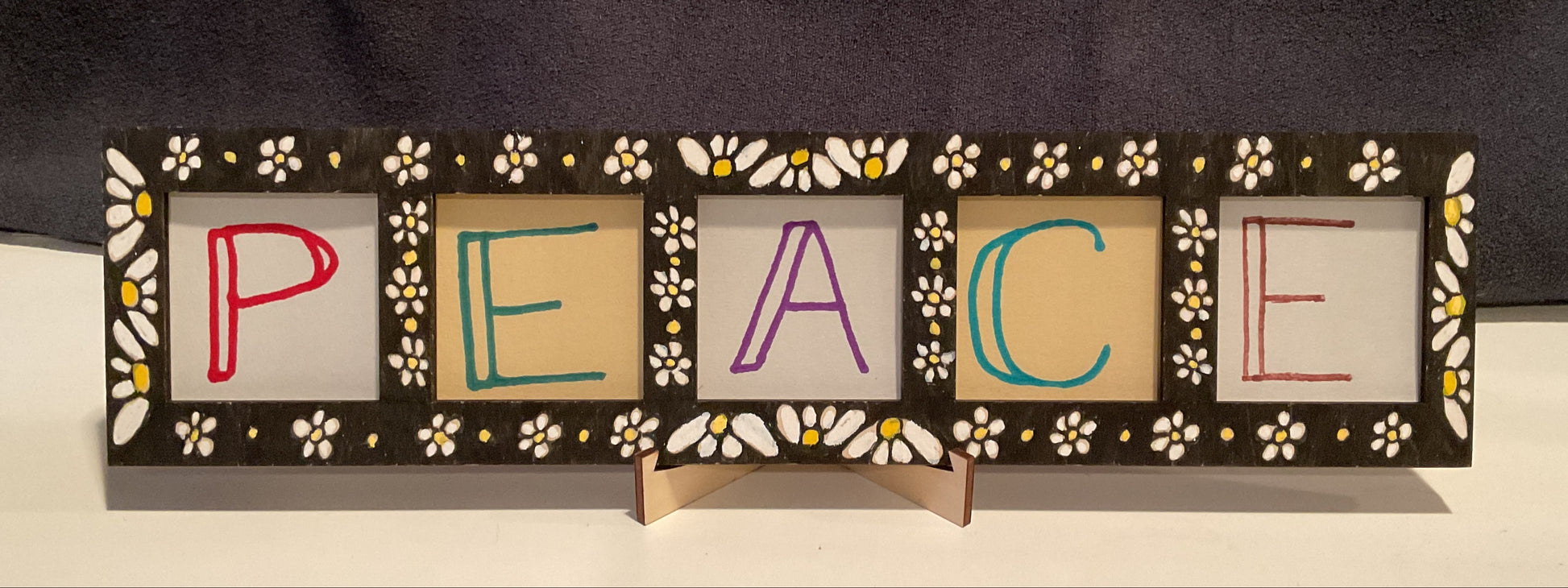 There is no wall hanger on this model. The center of the frame is all tile openings, so there’s no safe place to add hanging hardware without blocking a tile. Instead, it includes a matching freestanding stand (the paw-and-“grateful” legs used on my other frames). Attach the legs when you want it upright on your desk or shelf.