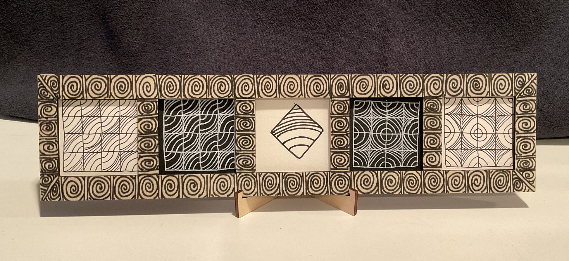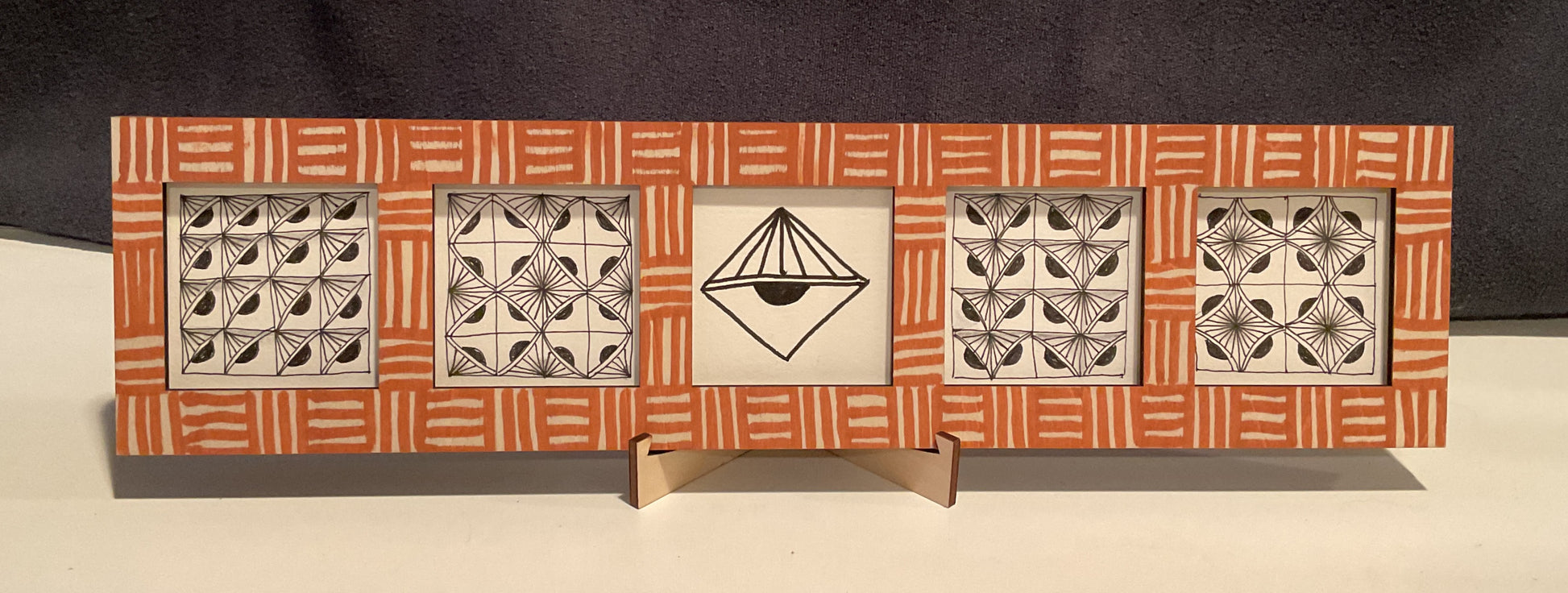 When you want to explore variations—five related fragments, a reticula study, or a tiny progression—this frame turns your work into a quiet, intentional gallery you can set right where you tangle.